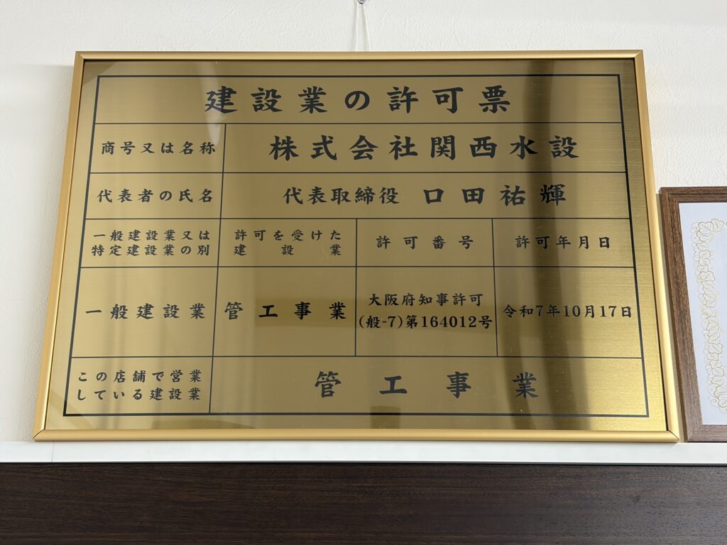 この度、関西水設は大阪府より建設業許可を取得いたしましたのでお知らせいたします。