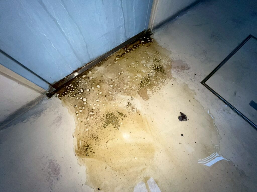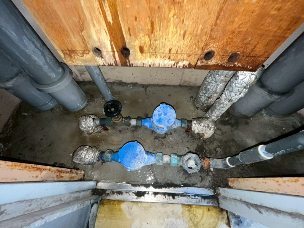 - 1階共用部パイプスペース内から漏水が発生し、廊下まで浸水