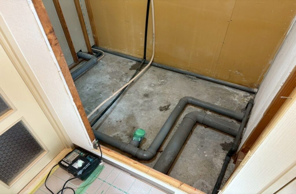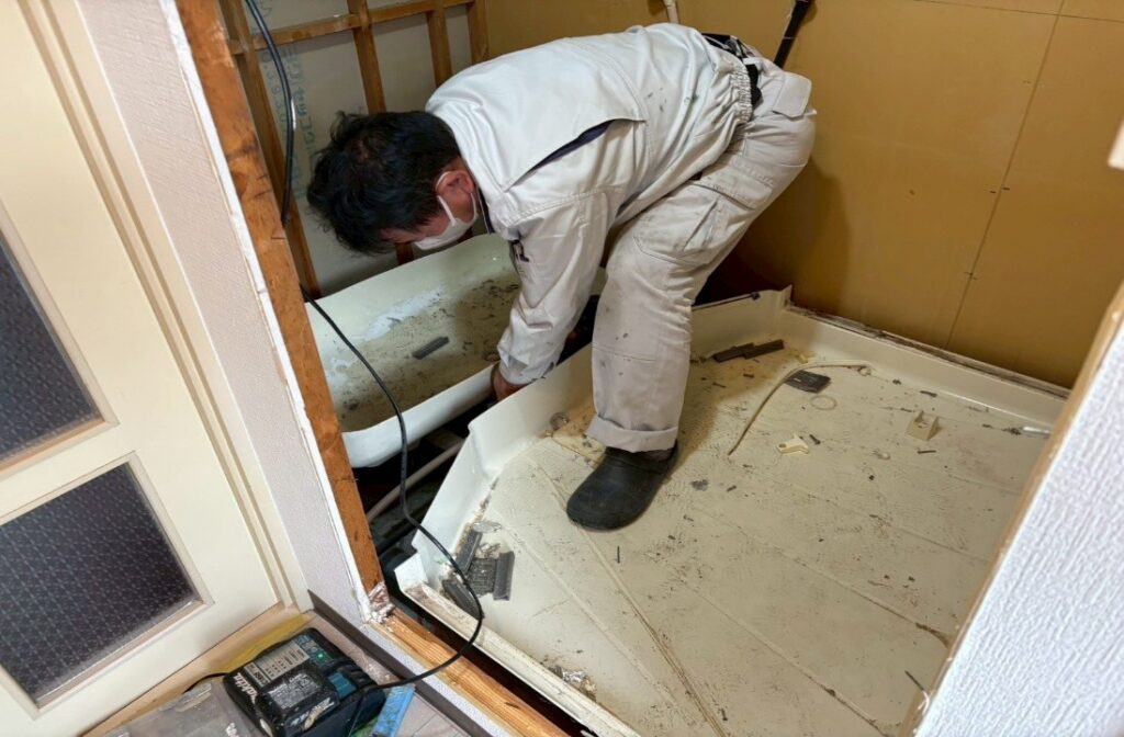 ◎配管状況から2階バスタブ下の給水管が原因と推定し、バスタブを全撤去して調査。